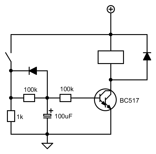 Un transistor che ha sul collettore la bobina del relè, emettitore a massa. La base collegata ad un elettrolitico che viene caricato attraverso una resistenza connessa al positivo. Quando dai tensione il condensatore si carica, appena la tensione è sufficiente il transistor conduce ed eccita il relè