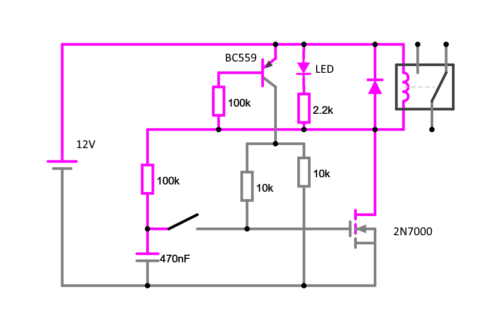 mi serve un circuitino che quandp premo un pulsnte un relais si eccita e si diseccita immediatamente ( meno di 0,5 sec) anche se il pulsante rimane premuto. l'alimentazione deve essere compresa tra 5 e 12 volt.se rilascio il pulsante non deve succedere niente ma se lo ripremo deve di nuovo eccitare e diseccitare lo stesso relais